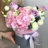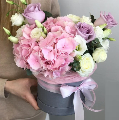 Шляпная коробка с гортензией, розами и лизуантусами | Купить в Бурсе